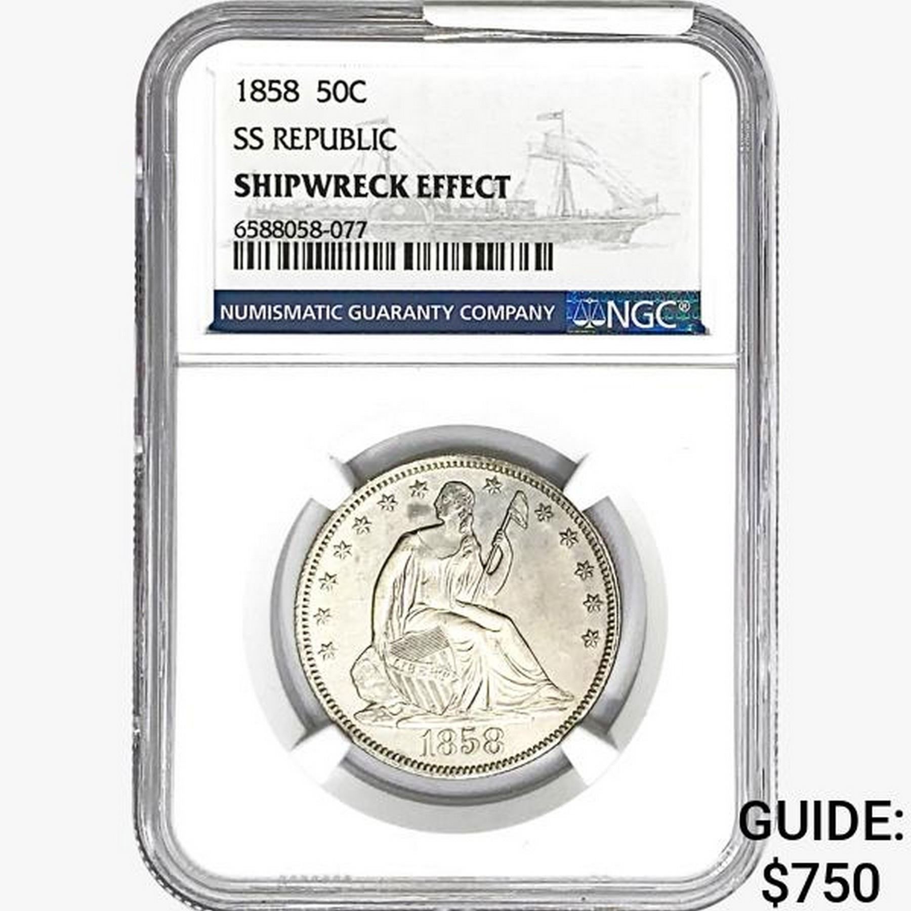 1858 Seated Lib. 50C NGC Shipwreck Effect SS REP.