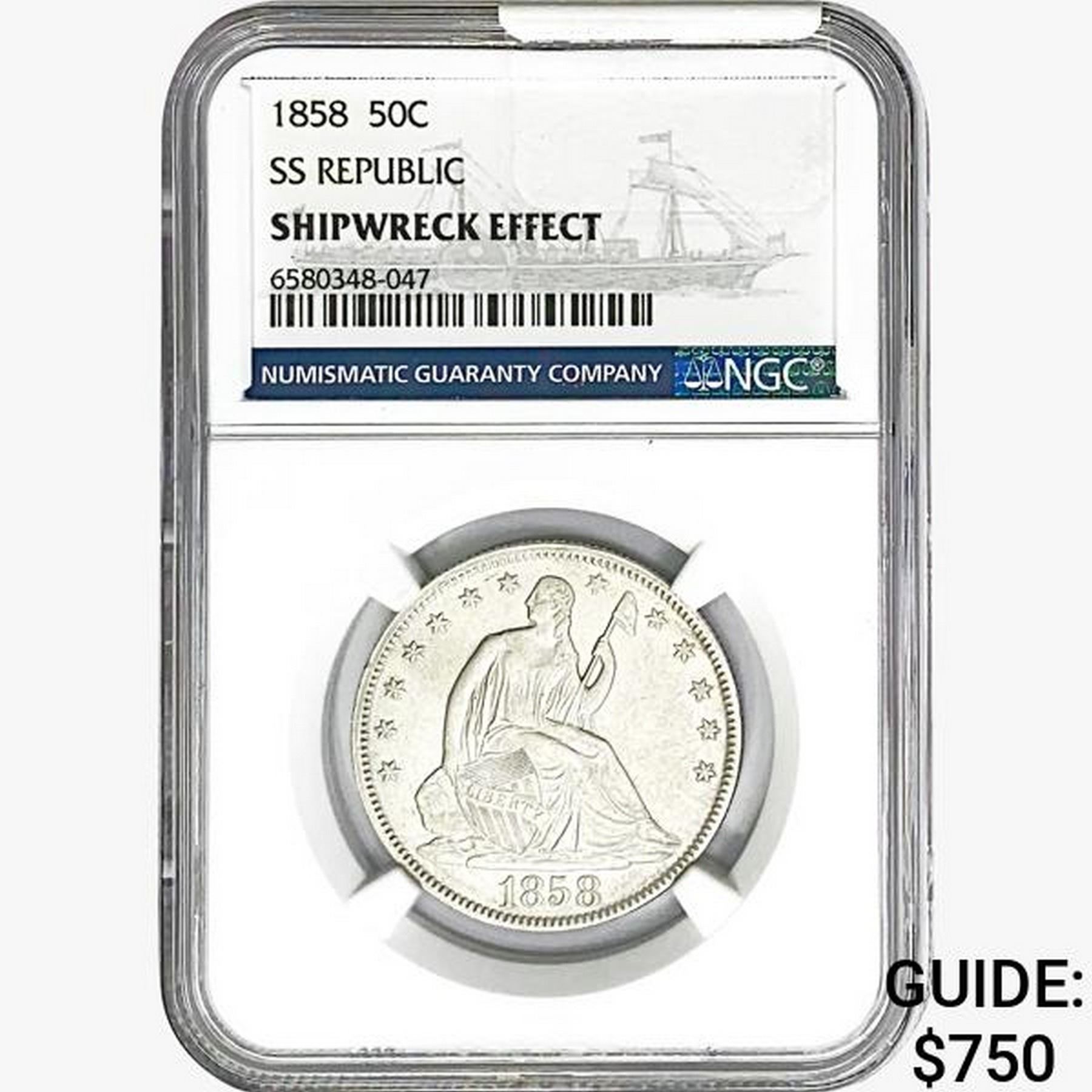 1858 Seated Lib. 50C NGC Shipwreck Effect SS REP.