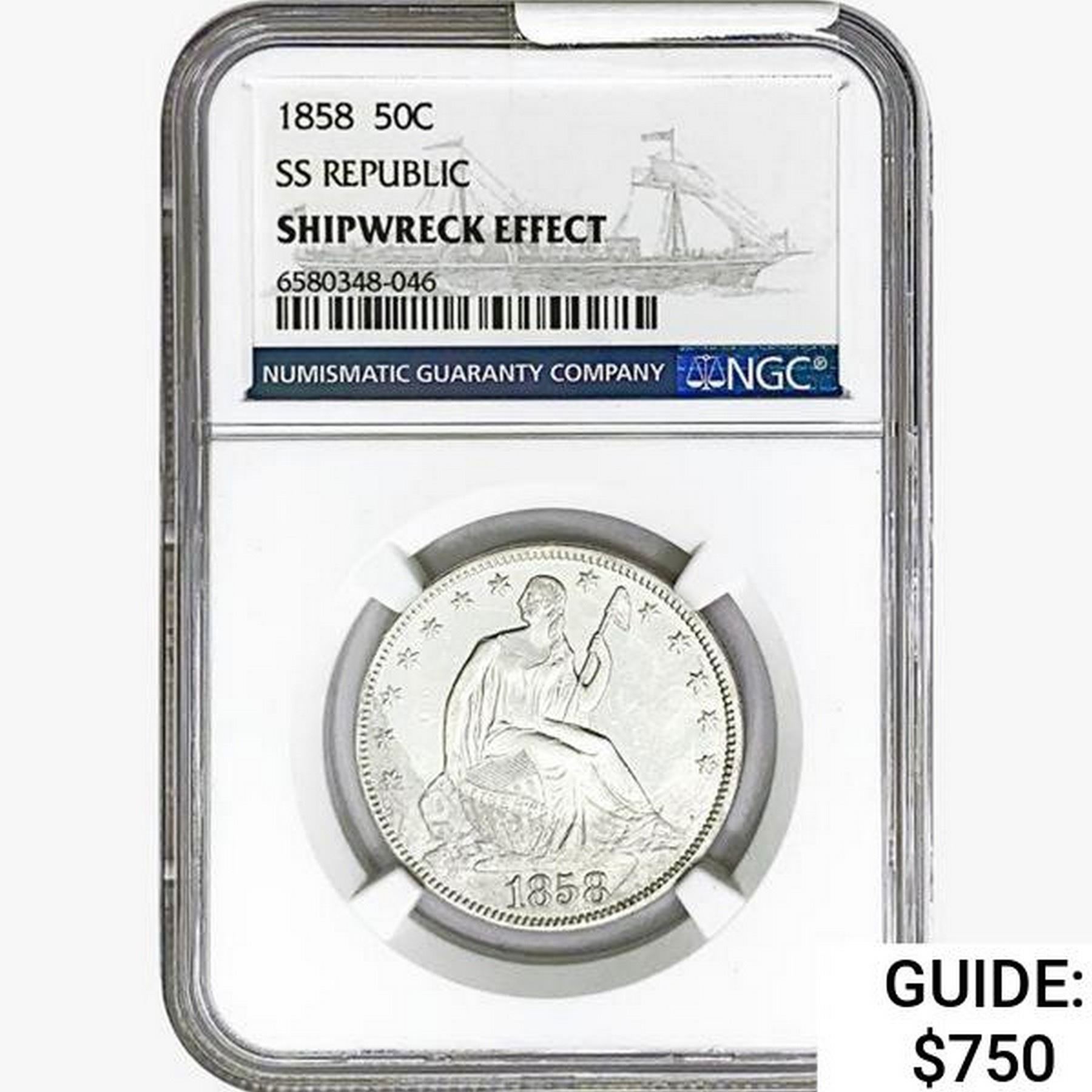 1858 Seated Lib. 50C NGC Shipwreck Effect SS REP.