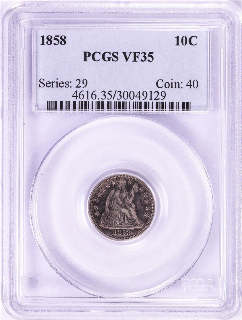 One 1858 Seated Liberty Dime Coin PCGS VF35. PCGS Graded.
