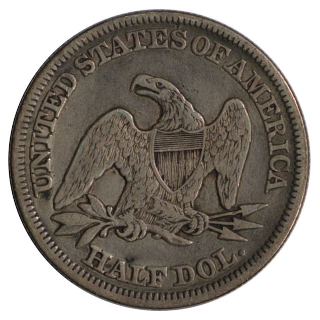 One 1858 Seated Liberty Half Dollar Coin.