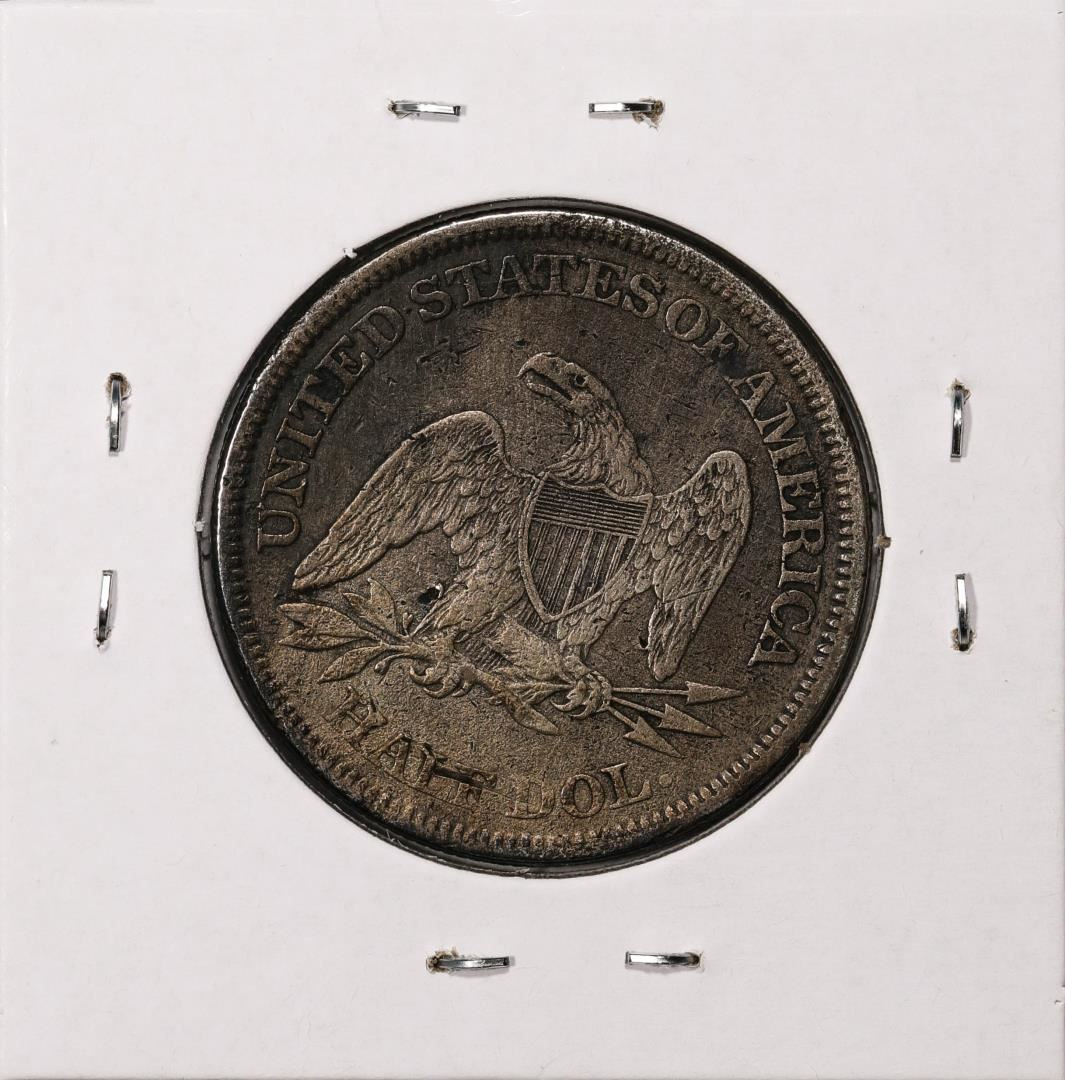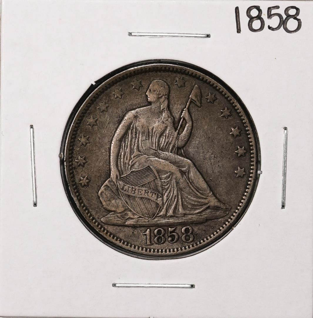 One 1858 Seated Liberty Half Dollar Coin.