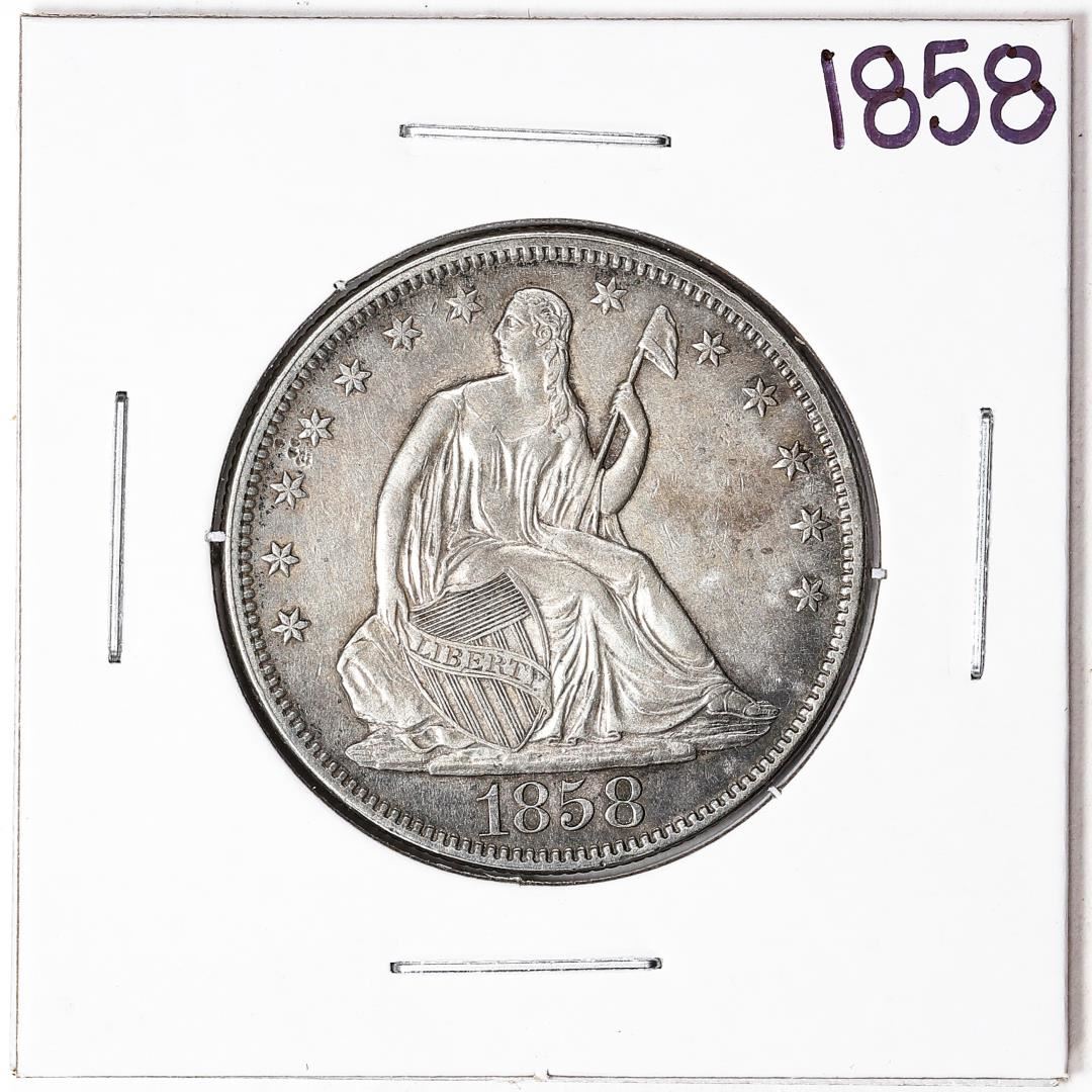 One 1858 Seated Liberty Half Dollar Coin.
