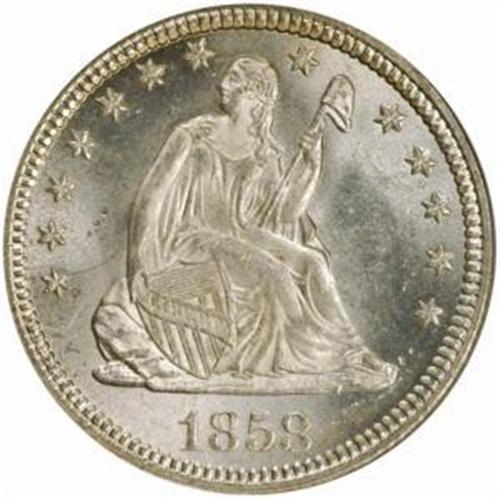 <style type="text/css"> body, td, th { font-family: Arial, Helvetica, sans-serif; font-size: 12px; color: #482424; margin: 0px; padding: 0px; } #header { background-image: url(http://www.bowersandmerena.com/ebay/images/template_v3_01.gif); clear: both; background-color: #590303; border-top-width: 2px; border-top-style: solid; border-top-color: #B38C4F;}#header #header_wrapper { height: 75px; clear: both; width: 800px; margin-right: auto; margin-left: auto; background-image: url(http://www.bowersandmerena.com/ebay/images/template_v3_03.gif); background-repeat: no-repeat; background-position: right; color: #F3EDCC;}#header #header_wrapper #header_logo { float: left; height: 75px; width: 444px; background-image: url(http://www.bowersandmerena.com/ebay/images/template_v3_02.gif); background-repeat: no-repeat; font-size: 10px; text-transform: capitalize; color: #B38C4F;}#header #header_wrapper #header_right { float: left; height: 75px; width: 356px; text-align: right;}#header #header_wrapper #header_right #headerLoginBtn { margin-bottom: 30px;}#header #header_wrapper #header_right input#txtSearch { color: #B49056; border: 1px solid #B49056; width: 175px; padding-top: 3px; padding-right: 3px; padding-bottom: 4px; padding-left: 3px;}#nav { height: 37px; background-image: url(http://www.bowersandmerena.com/ebay/images/template_v3_05.gif); clear: both;}#nav #nav_wrapper { height: 35px; width: 800px; margin-right: auto; margin-left: auto; border-left-width: 1px; border-left-style: solid; border-left-color: #B38C4F;}#nav #nav_wrapper a { padding-right: 15px; padding-left: 15px; border-right-width: 1px; border-right-style: solid; border-right-color: #B38C4F; height: 25px; padding-top: 10px; display: block; float: left; text-decoration: none; font-weight: bold; color: #5D0303;}#nav #nav_wrapper a:hover { color: #B38C4F;}#nav #nav_wrapper #search { float: right; padding-top: 7px;}#nav #nav_wrapper #search #txtSearch { font-family: Arial, Helvetica, sans-serif; font-size: 10px; text-transform: uppercase; color: #D2AE75; border: 1px solid #B38C4F; padding: 3px;}#content_bgd { background-image: url(http://www.bowersandmerena.com/ebay/images/template_v3_09.gif); background-repeat: repeat-y; background-position: center; padding-top: 15px; padding-bottom: 15px; background-color: #FBFBDB;}#content_wrapper { clear: both; height: auto; width: 800px; margin-right: auto; margin-left: auto;}.LotDetailWhite{ line-height:normal; font-size:13px; font-family: arial,helvetica,sans-serif; color: White; font-weight: bold;}.LotDetailInformation{ line-height:normal; font-size: 13px; font-family: arial,helvetica,sans-serif;}.LotDetailMessage{ line-height:normal; font-size: 13px; font-family: arial,helvetica,sans-serif; color: red;}}tr.HeaderAuctionTitle td { color: #000000; font-weight: bold; padding: 2px; background-image: url(http://www.bowersandmerena.com/ebay/images/template_v3_05.gif); background-repeat: repeat-x; border-bottom-width: 1px; border-bottom-style: solid; border-bottom-color: #B38C4F;}table.AuctionSummary a, table.AuctionSummary a:link, table.AuctionSummary a:visited { color: #0000FF; text-decoration: none;}}td.tableHeaderLeft { border-left-width: 1px; border-left-style: solid; border-left-color: #B38C4F;}td.tableHeaderRight { border-right-width: 1px; border-right-style: solid; border-right-color: #B38C4F;}td.tableCellMiddle { border-left-width: 1px; border-left-style: solid; border-left-color: #B38C4F; border-right-width: 1px; border-right-style: solid; border-right-color: #B38C4F; padding: 5px;}tr.footer td { border-top-width: 1px; border-top-style: solid; border-top-color: #B38C4F;}</style></head><body><div id="header"> <div id="header_wrapper"> <div id="header_logo"> </div> <div id="header_right"> </div> </div></div><div id="nav"> <div id="nav_wrapper"> <a href="http://www.bowersandmerena.com">Our eBayLive Auctions</a> <a href="#PaymentInfo">Payment Information</a> <a href="#ShippingInfo">Shipping Information</a> <a href="#About">About Bowers and Merena</a> </div></div><div id="content_bgd"> <div id="content_wrapper"> <table width="100%" border="0" cellpadding="5" cellspacing="0" class="AuctionSummary"> <tbody> <tr class="HeaderAuctionTitle" style="height: 25px;"> <td align="left" class="tableHeaderLeft" > </td> <td align="center" class="tableHeaderRight"> <span style="font-size: large;">Lot #507. 1858 Seated Liberty Quarter. MS-65 (PCGS).</span> </td> </tr> <tr> <td colspan="3" class="tableCellMiddle"> Radiant, otherwise frosty-textured surfaces reveal the faintest trace of semi reflectivity in the fields as the coin rotates under a light. A brilliant, fully struck Gem that would make a lovely addition to a high-quality type set.