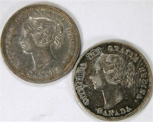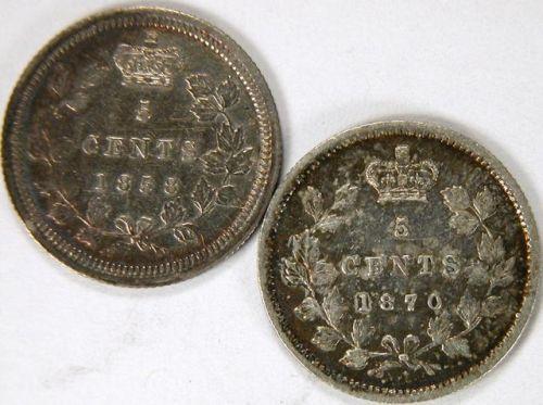 Canada Five Cents 1858 Small Date and 1870 Narrow Rims, both EF and lightly toned
