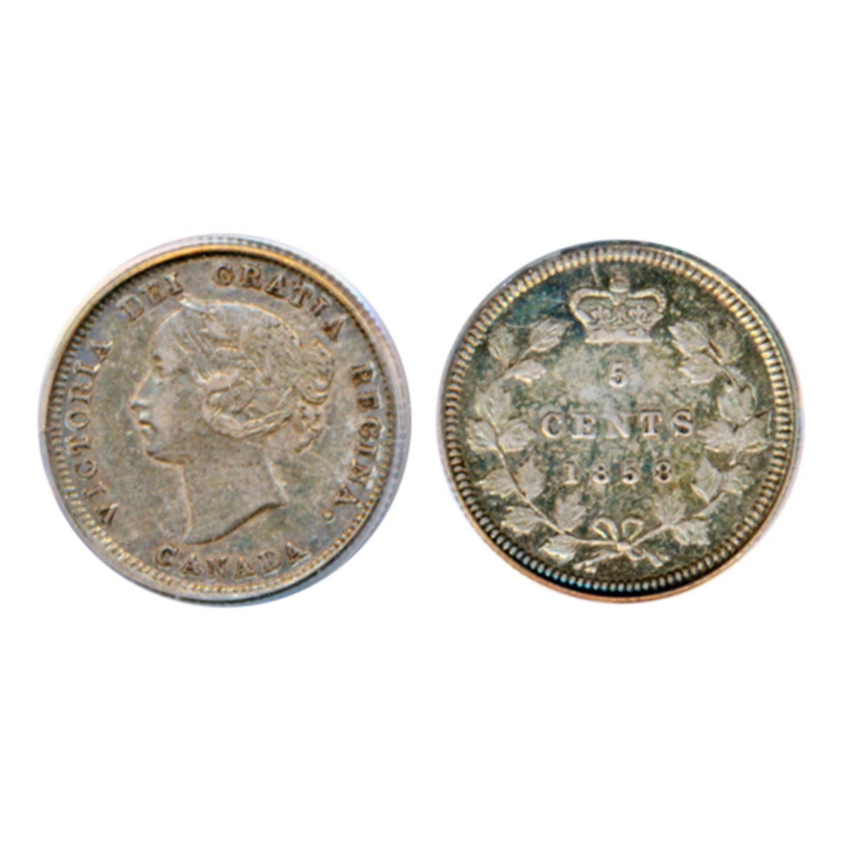 1858. Small Date. PCGS graded AU-53. Medium heavy toning.