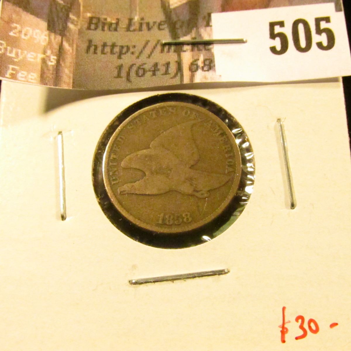 1858 Small Letters Flying Eagle Cent, G+, value $30