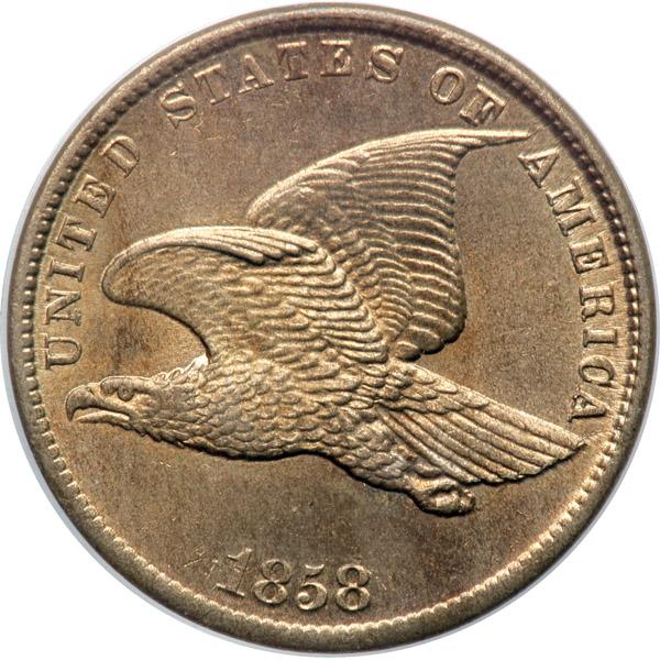 1858. Small Letters. PCGS graded MS-64+. CAC Approved. Lovely light toning on this attractive Flying Eagle Cent. Pop 2; 66 finer (PCGS # 2020) .