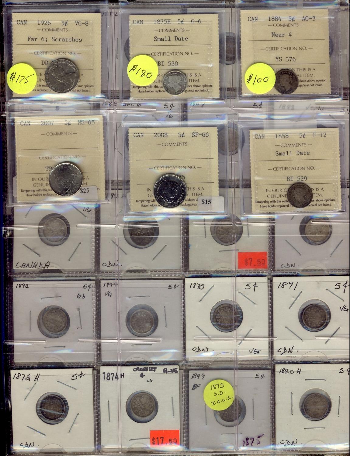 1858 Sml - 2010 5¢. Lot of 143 coins with no doubles, Includes key dates, 1875H Sm ICCS G6, 1884 I
