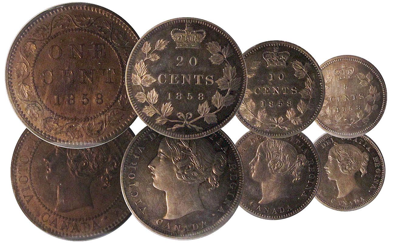 1858 Specimen Set, includes 1858 1¢ Scarce Rotated Dies, 5¢ Sml Date, 10¢, 20¢ ICCS SP64 Plain Edg