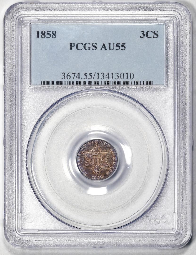 One 1858 Three Cent Silver Coin PCGS AU55 Nice Toning. PCGS Graded.