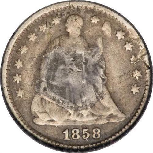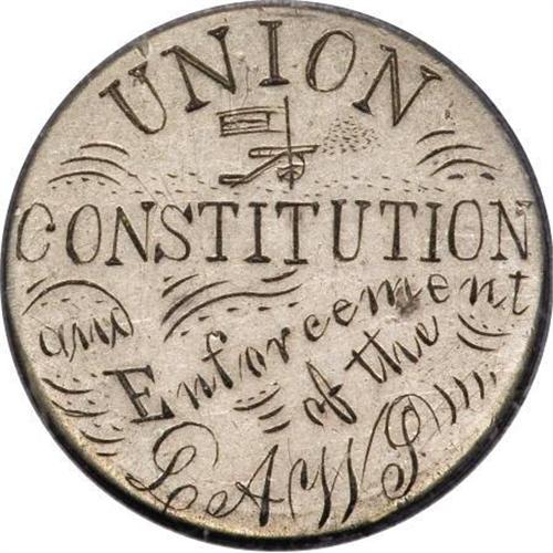 <B>1858 U.S. Engraved Half Dime.</B></I> (1861-1865) Silver U.S. half dime that has been engraved on the planed-off reverse: "Union (flag and cannon) Constitution / and / Enforcement / of / the / LAWS." An interesting memento from one of the darkest periods in American history.<BR><BR><b>Shipping:</b> Coins & Currency (<a target="_blank" href="http://www.heritageauctions.com/common/shipping.php">view shipping information</a>)