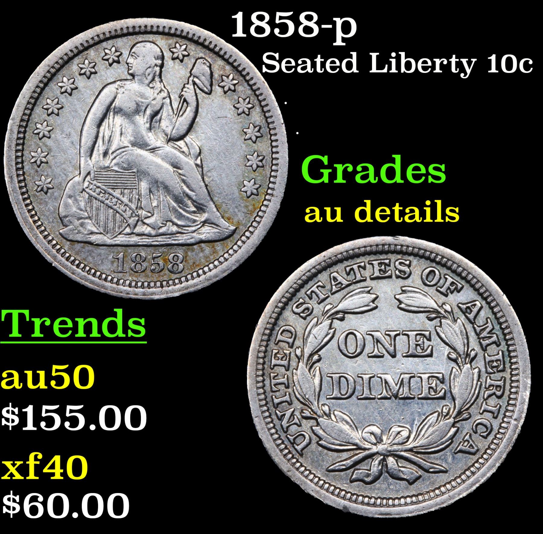 1858-p Seated Liberty Dime 10c Grades AU Details.