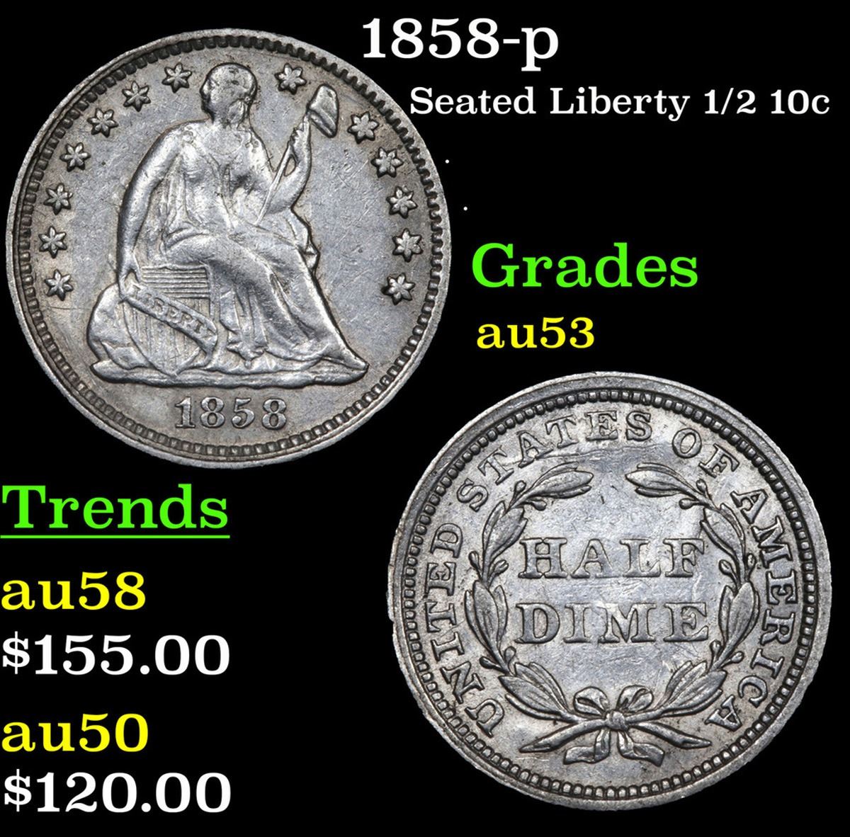1858-p Seated Liberty Half Dime 1/2 10c Grades Select AU.