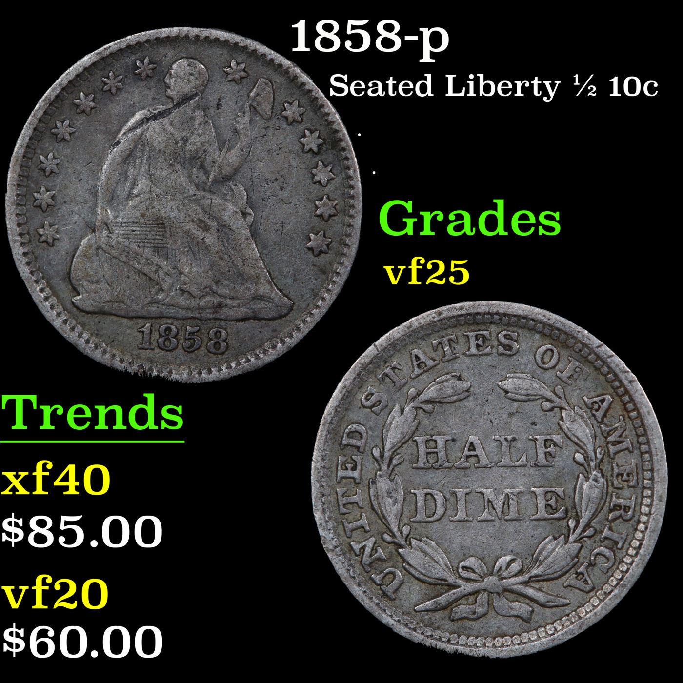1858-p Seated Liberty Half Dime 1/2 10c Grades vf+.