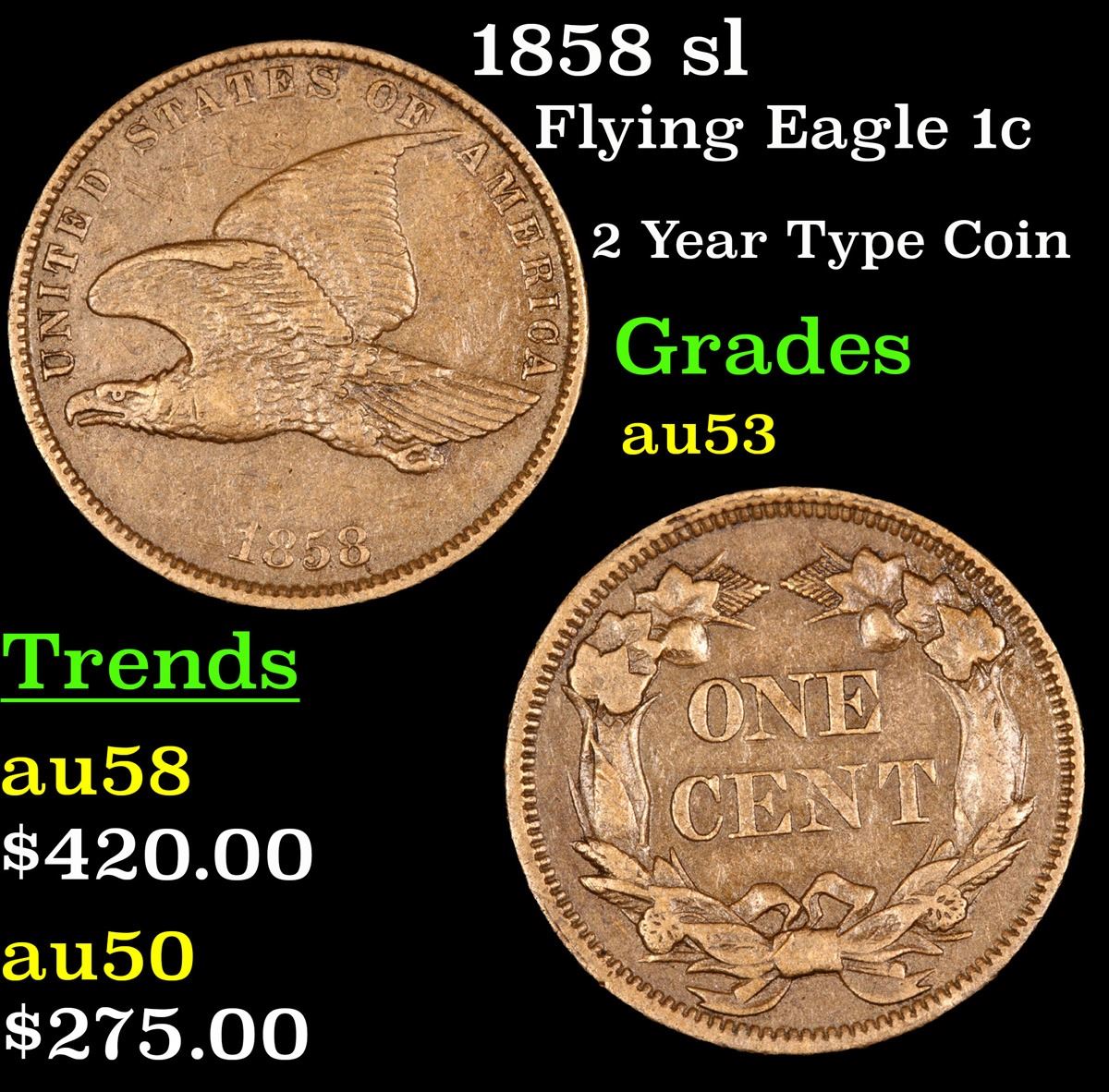 1858 sl 2 Year Type Coin . Flying Eagle Cent 1c Grades Select AU.