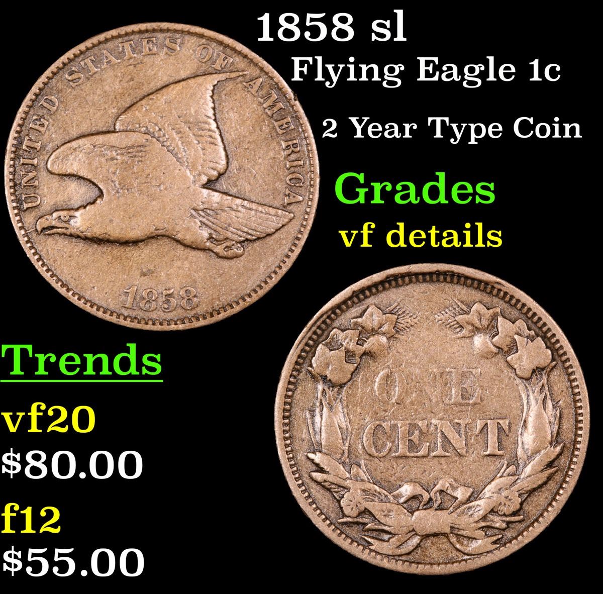 1858 sl 2 Year Type Coin . Flying Eagle Cent 1c Grades vf details.