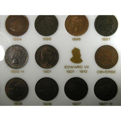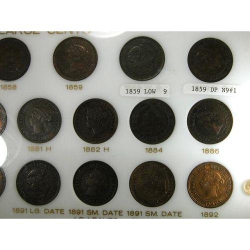 1858 to 1920 in a capital holder. The 1858, 1859 Double Punched #1, 1859 Wide 9 Over 8 and 1891 Small Sate Small Leaves are EF or better, the 1859 Double Punched #2 is VF, the 1891 Small Date Large Leaves is VG-F. There are AU and better examples among each of the Victoria, Edward and George pieces. Fifty one pieces