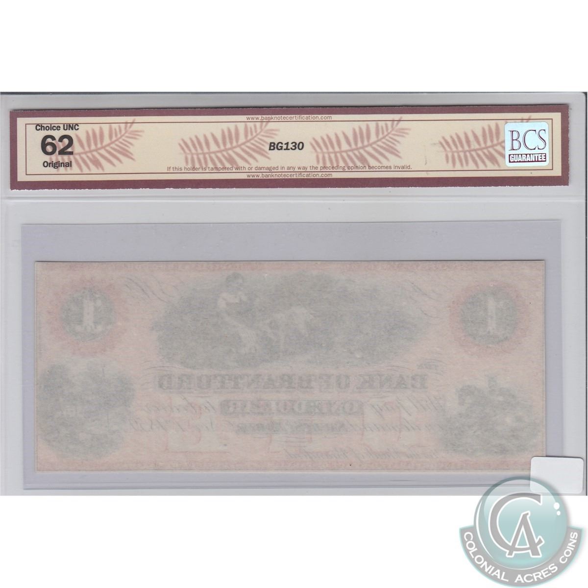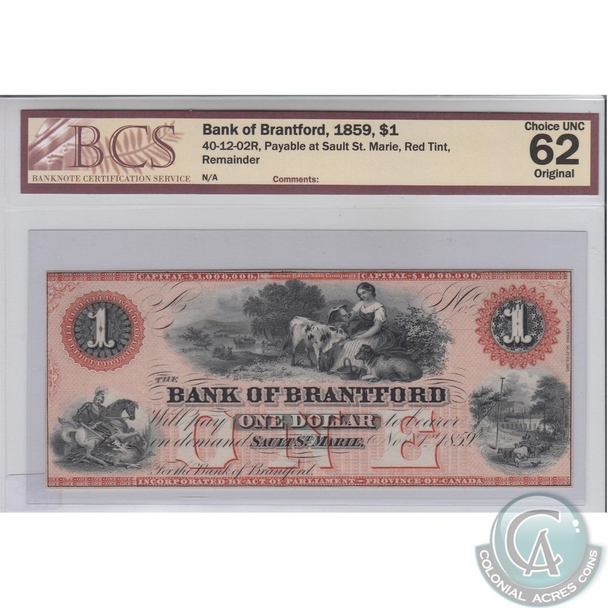 1859 $1.00 Bank of Brantford Note; Cat Code 40-12-02R, Payable at Sault St. Marie, Red Tint BCS Certified CUNC-62