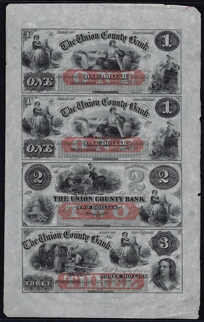 One 1859 $1-$1-$2-$3 Uncut Sheet of The Union County Bank NJ Obsolete Notes.