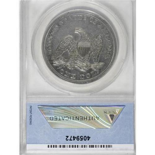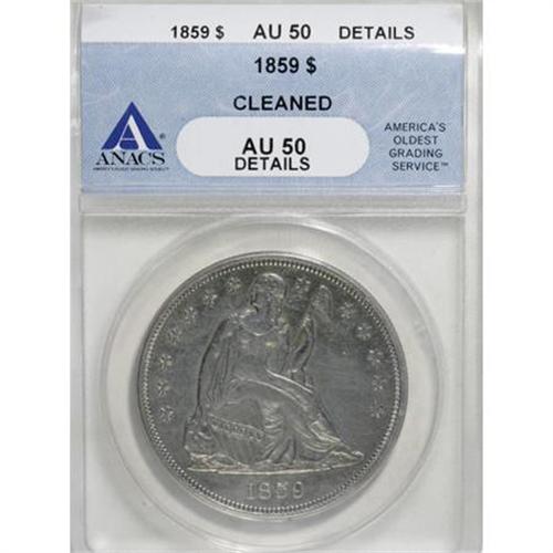 <B>1859 $1 --Cleaned--ANACS. AU50 Details.</B></I> Untoned and unnaturally prooflike with moderately bright fields. A minor reverse rim ding at 1:30, but otherwise void of noticeable marks. The devices have only minimal wear.<BR><BR><B>Coin Engraver:</B> Christian Gobrecht<BR><BR><b>Shipping:</b> Coins & Currency (<a target="_blank" href="http://www.heritageauctions.com/common/shipping.php">view shipping information</a>)
