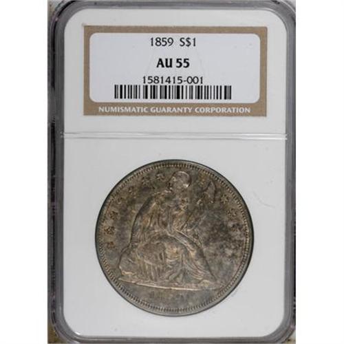 <B>1859 $1 AU55 NGC.</B></I> This is a scarce date in comparison to the 1859-O hoard issue. The surfaces are faintly hairlined, with mottled gold, heather, and steel toning.<BR><BR><b>Shipping:</b> Coins & Currency (<a target="_blank" href="http://www.heritageauctions.com/common/shipping.php">view shipping information</a>)