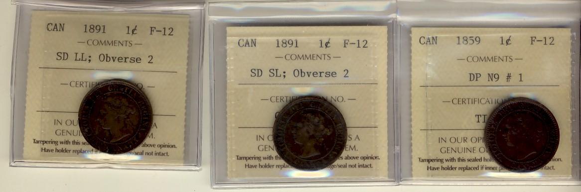 1859 1¢ DP N9 #1, 1891 SD SL Obv 2 & SD LL Obv 2 ICCS F12. Lot of 3 coins.