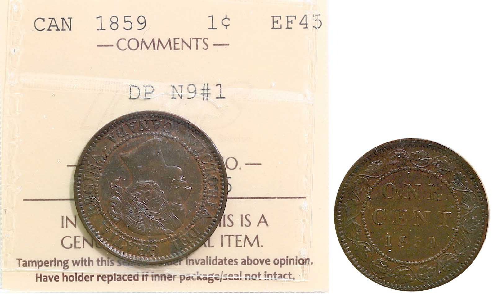 1859 1¢ "DP N9 #1" ICCS Choice Extra Fine-45, Sharp details with light remaining lustre. A pleasing example.