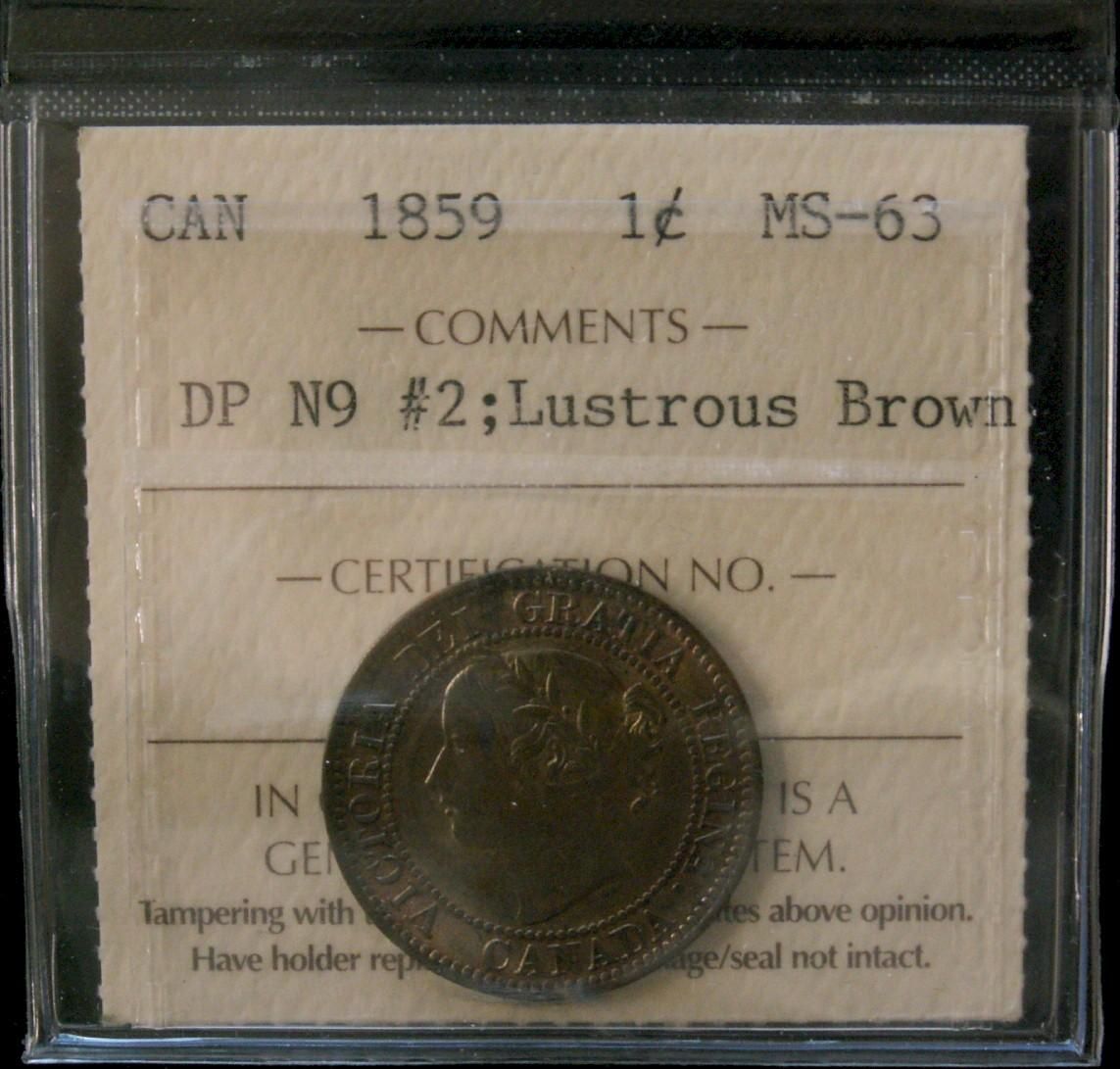 1859 1¢ DP N9 #2 ICCS MS63 Lustrous Brown.