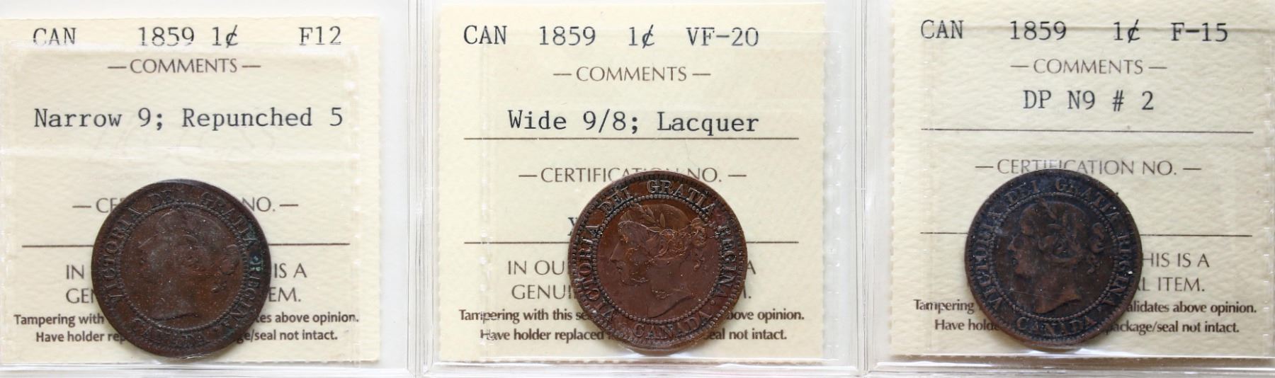 1859 1¢ 'N.9; Repunched 5", 1859 "DP N9 #2", 1859 "Wide 9/8, laquer, All 3 coins ICCS Fine-12 to Ver