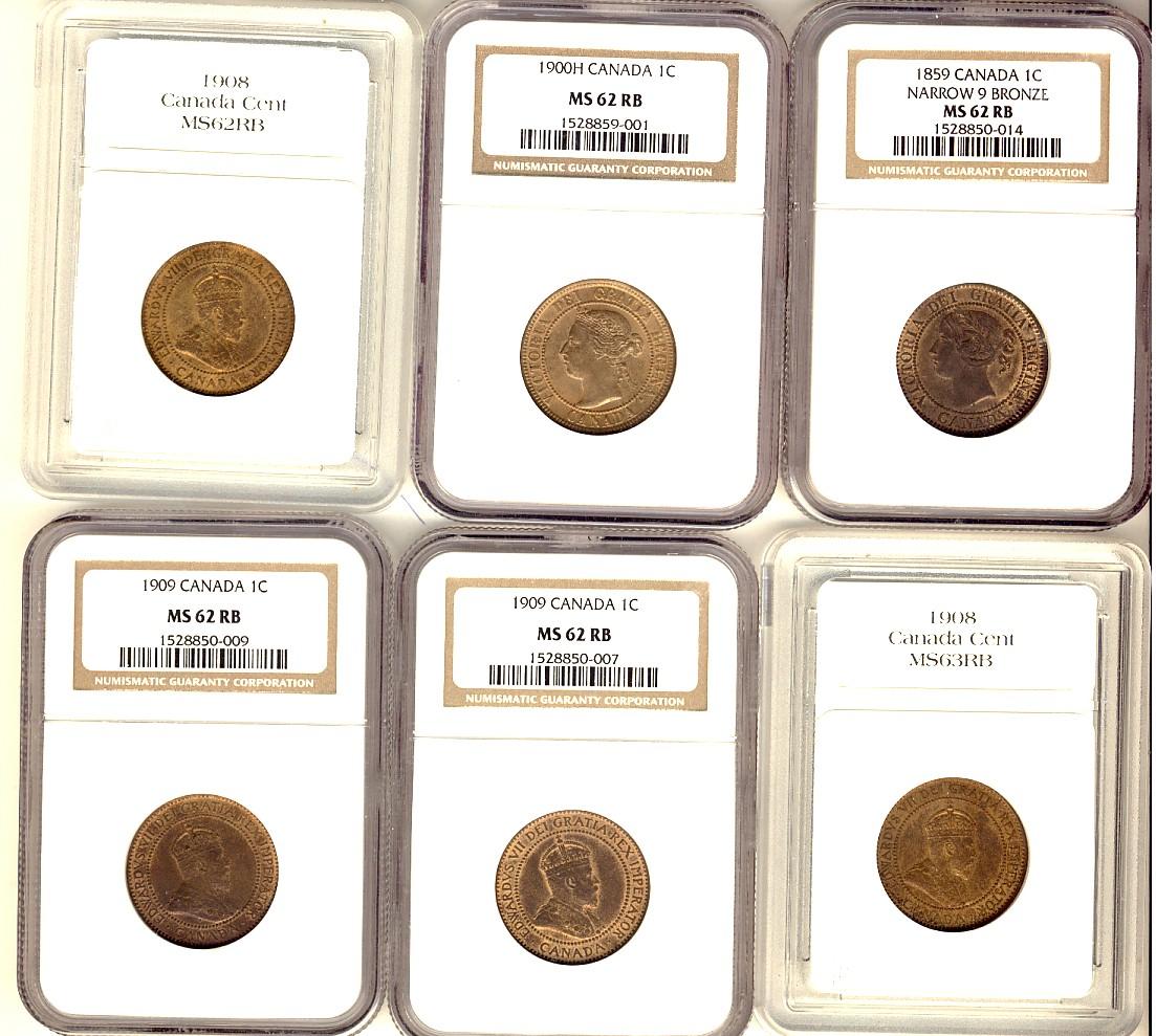 1859 1¢ N9, 1900H, 1908(2) & 1909(2). Lot of 6 cents all MS62RB, 4 graded by NGC. Should be viewed.
