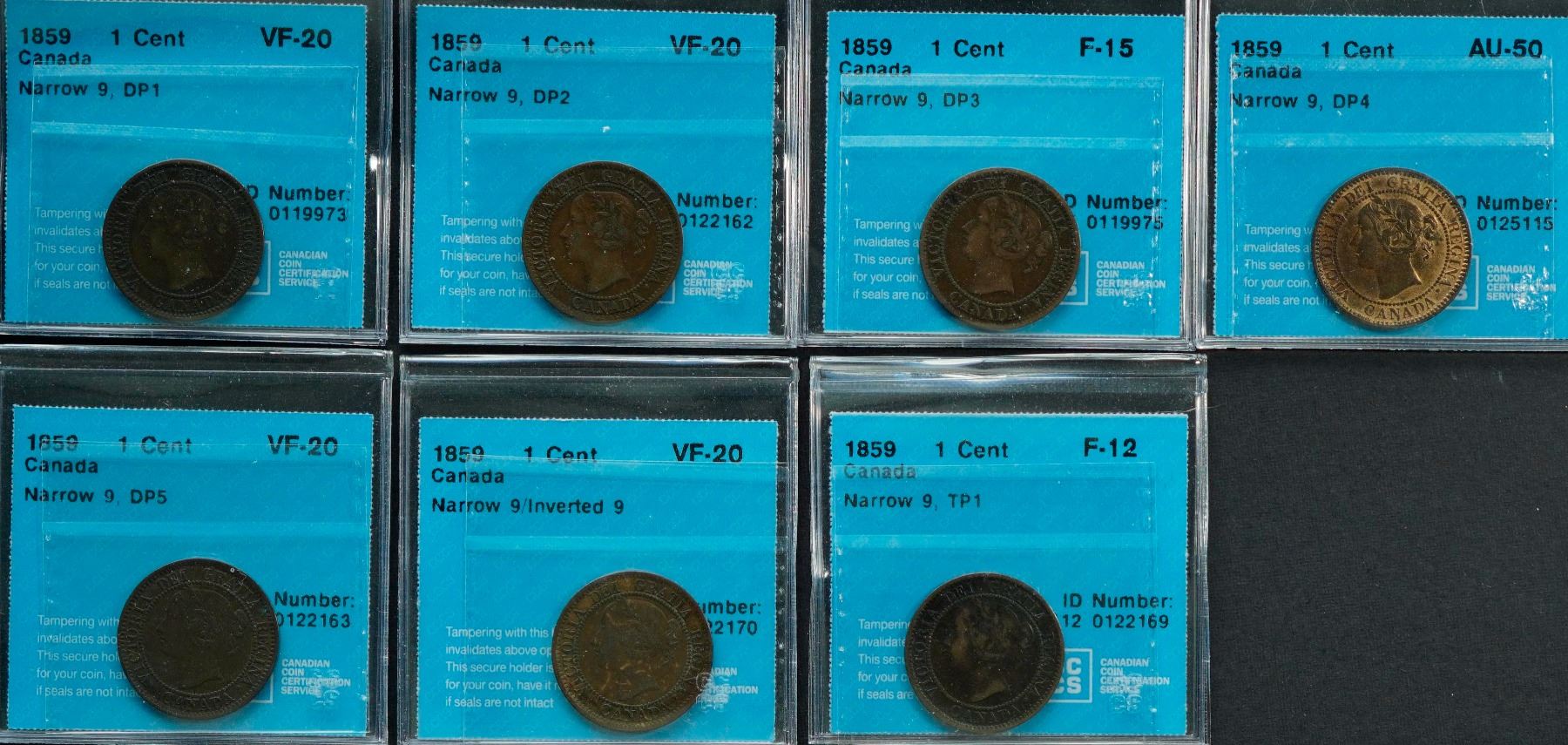 1859 1¢ N9 DP1 Very Fine-20, N9, DP2 Very Fine-20, N9, DP3 Choice Fine-15, N9 DP4 About Uncirculated-50, N9 DP5 Very Fine-20, N9/ Inverted 9 Very Fine-20 and N9, TP1 Fine-12, all CCCS graded, lot of 7 coins.