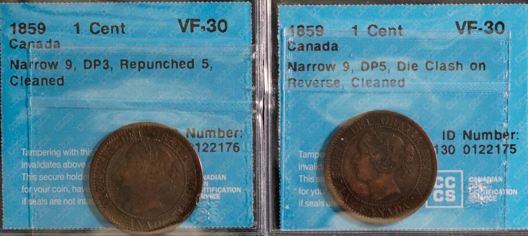 1859 1¢ N9, DP3, Repunched 5 & 1859 N9, DP5, Die Clash on Reverse, both CCCS Choice Very Fine-30 Cle