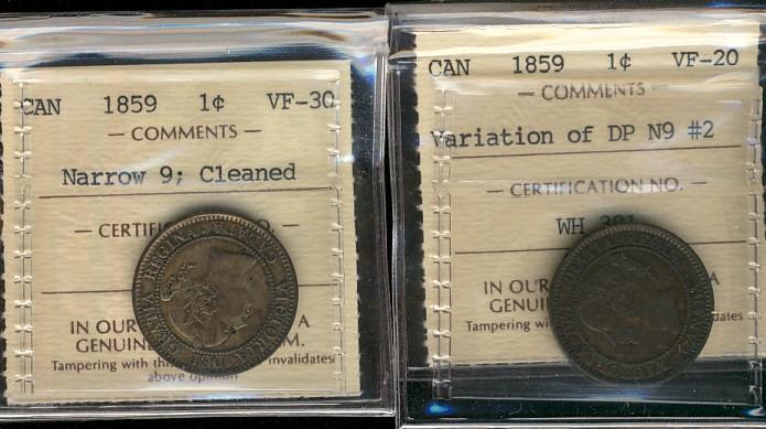 1859 1¢ N9 VF30 & DP N9 #2 VF20. Lot of 2 coins both ICCS graded. Nar 9 is designated as cleaned.
