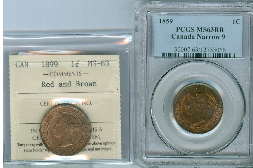 1859 1¢ Nar 9 PCGS MS63RB and 1899 1¢ ICCS MS63RB. Lot of two coins.