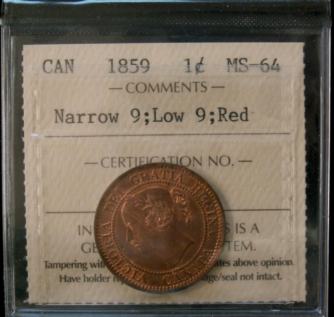 1859 1¢ Nar Low 9 ICCS MS64RD. Superb example with strong lustre and 85% red.