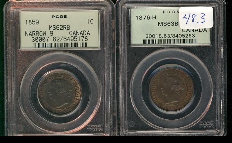 1859 1¢ Narrow 9 MS62RB & 1876H MS63BN. Lot of 2 PCGS graded coins