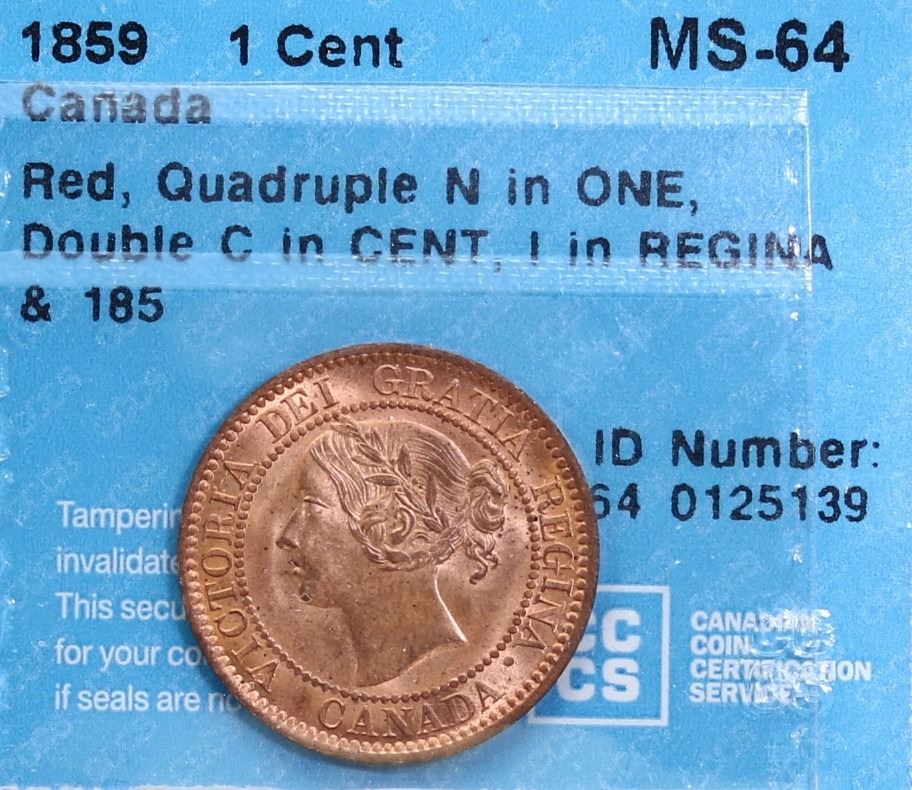 1859 1¢ Quadruple "N" in ONE, DOUBLE "C" in CENT, "I" in REGINA & 185. CCCS Choice Mint State-64 95% RED lustre. To our knowledge, this is the only known example ! The coin is exceptional," Collector T.S. said in a statement, "because this is the first example to surface in over 50 years. This amazing variety may realize over estimate. believed to be quite rare.