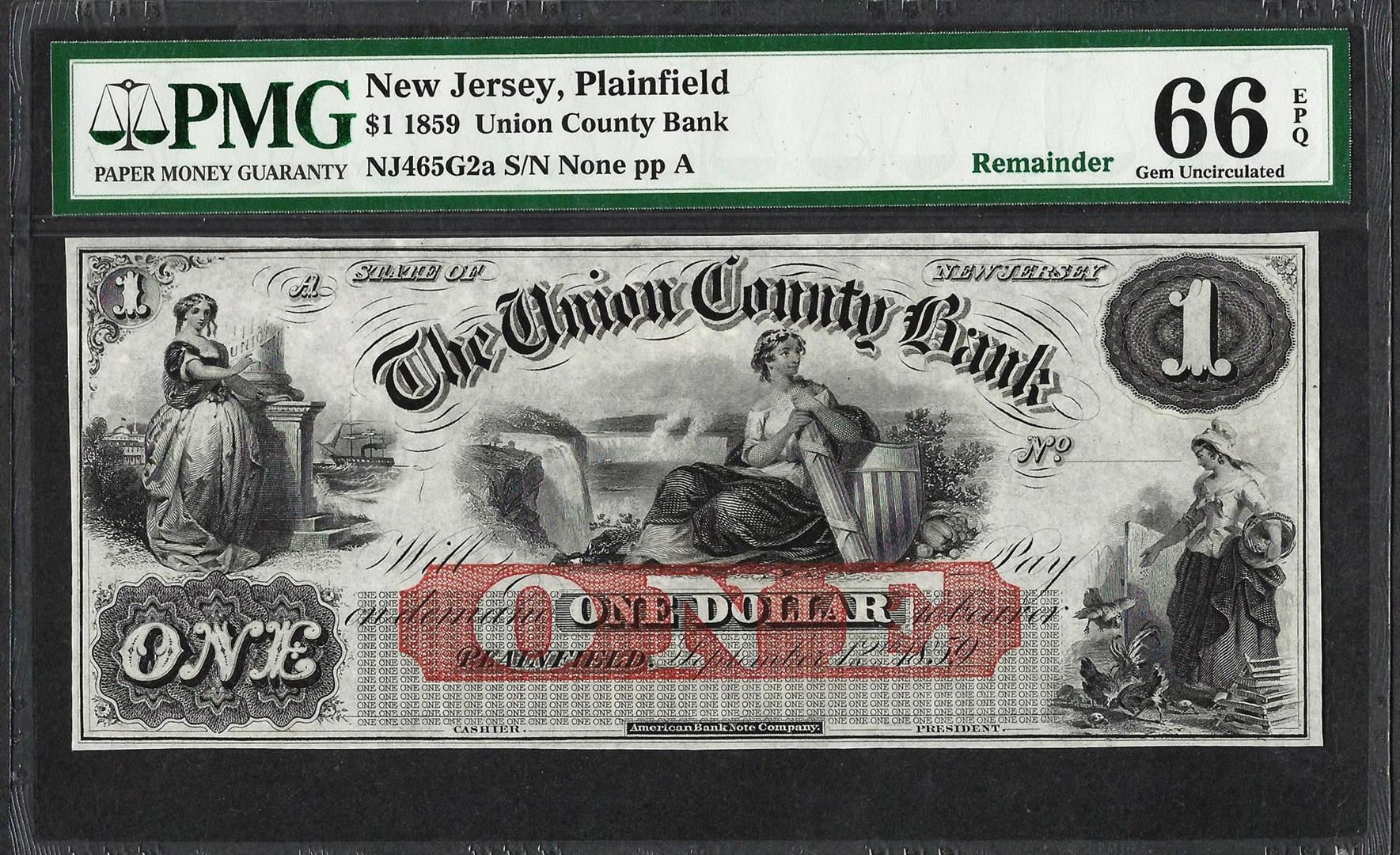 One 1859 $1 Union County Bank Plainfield, NJ Obsolete Note PMG Gem Uncirculated 66EPQ. PMG Certified.