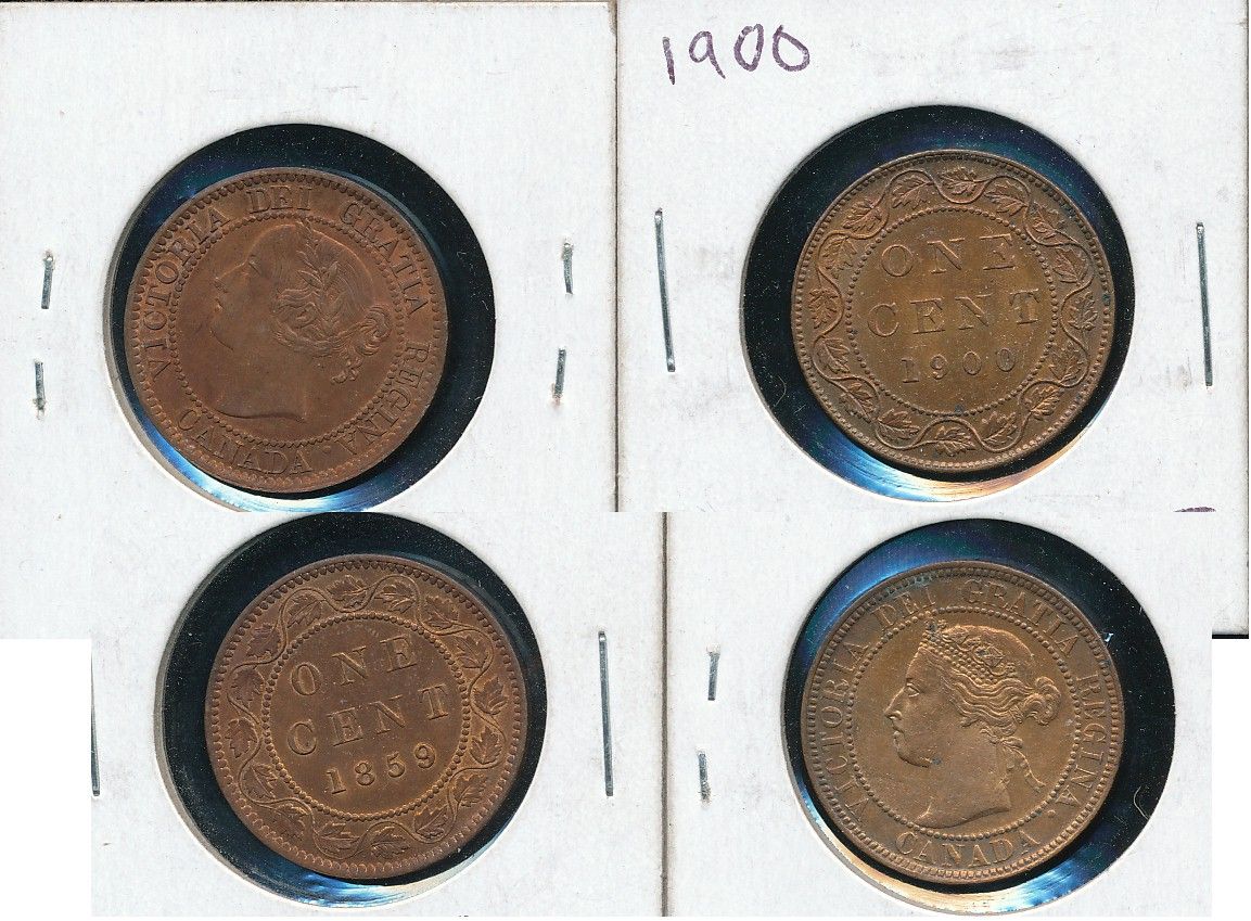 1859 1¢ W9 & 1900. Lot of 2 coins both MS60 and better with possible old cleaning. Both coins with lustre. Should be viewed.