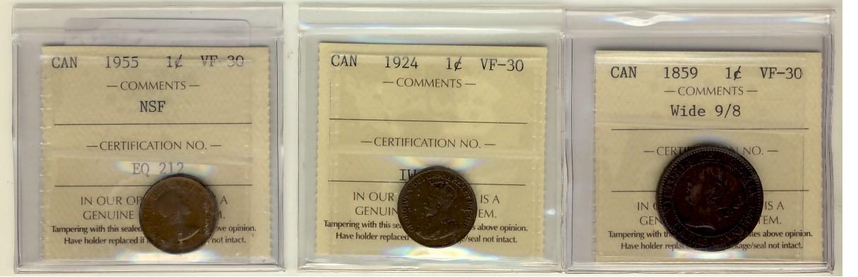 1859 1¢ W9/8, 1924 & 1955 NSF ICCS VF30. Lot of 3 coins.
