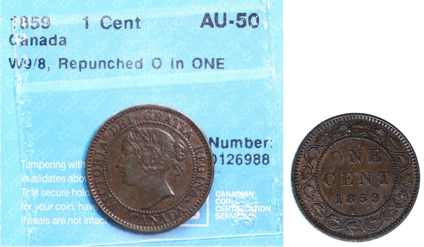 1859 1¢ W9/8, Repunched "O" in ONE CCCS About Uncirculated-50