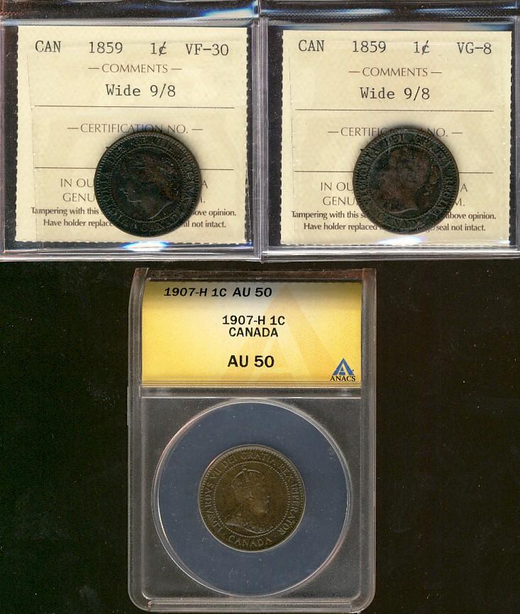 1859 1¢ W9/8 VG8, VF30 & 1907H ANACS AU50. Lot of 3 coins.