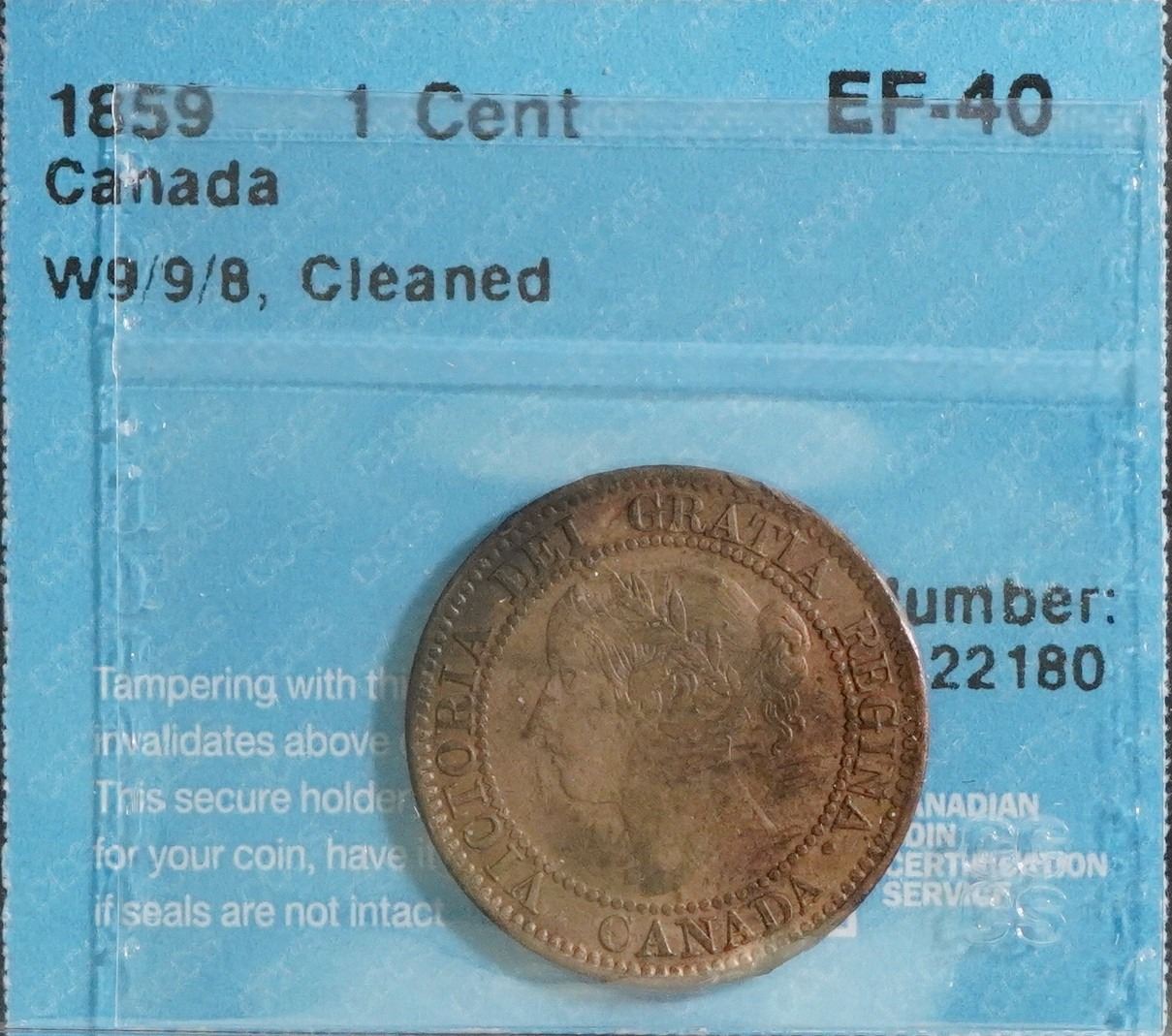 1859 1¢ W9/9/8 CCCS Extra Fine-40 Cleaned Very Rare.