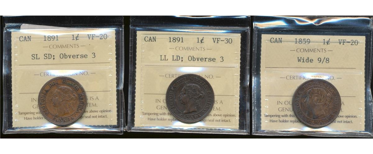 1859 1¢ Wide 8/9 VF20, 1891 LLLD Obv 3 VF30 & 1891 SLSD Obv 3 VF20. Lot of 3 coins all ICCS graded .