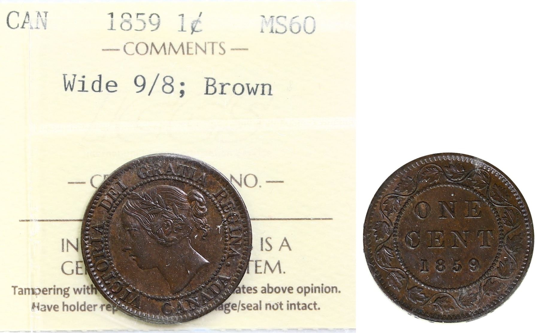 1859 1¢ "Wide 9/8" ICCS Mint State-60 Lustrous brown example.