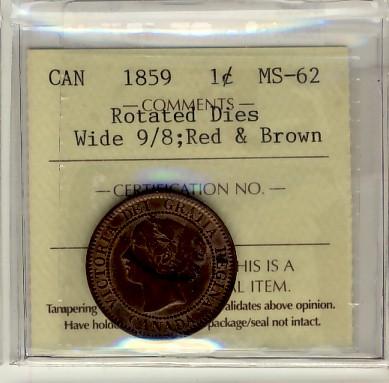 1859 1¢ Wide 9/8 Rotated Dies ICCS MS62RB.