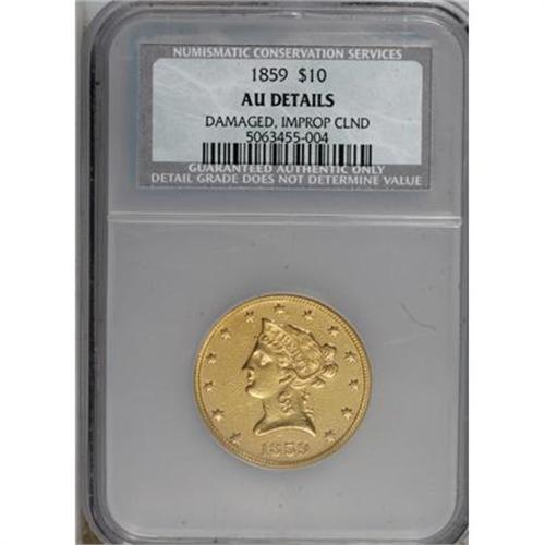 <B>1859 $10 --Damaged, Improperly Cleaned--NCS. AU Details.</B></I> NGC Census: (13/85). PCGS Population (11/22). Mintage: 16,093. Numismedia Wsl. Price for NGC/PCGS coin in AU50: $1,125. (#8628)<BR><BR><B>Coin Engraver:</B> Christian Gobrecht<BR><BR><b>Shipping:</b> Coins & Currency (<a target="_blank" href="http://www.heritageauctions.com/common/shipping.php">view shipping information</a>)