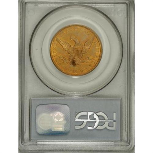 <B>1859 $10 AU53 PCGS.</B></I> Orange luster fills design recesses, while the open fields and cheek are steel-blue. Small marks are dispersed, and a small rose-red alloy spot is at the base of the fletchings. A little-seen issue with a low mintage of 16,093 pieces. Population: 7 in 53, 15 finer (3/08).<BR><BR><B>Coin Engraver:</B> Christian Gobrecht<BR><BR><b>Shipping:</b> Coins & Currency (<a target="_blank" href="http://www.heritageauctions.com/common/shipping.php">view shipping information</a>)