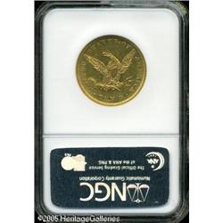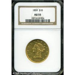 <B>1859 $10 AU55 NGC.</B></I> The 1859 is a rare issue with only 16,013 pieces struck. This Choice example shows only slight friction over the highpoints. The central striking details are well defined, but softness is noted on the peripheral stars. There are numerous small abrasions scattered over each side with a cluster of marks in the lower left obverse field. Lot:8757
